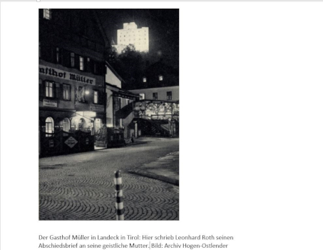 Die wohl letzte Nacht seines Lebens hat Leonhard Roth vom 21. auf den 22. Juni 1960 im Gasthof Müller in Landeck in Tirol verbracht. Dort schrieb er um 4.10 Uhr einen kurzen Brief an seine geistliche Mutter, Rösli Hirtler in Luzern (Unterstreichungen vom Schreiber): „Unten, wo die Menschen ihre willkürliche Zivilisation betreiben, ist Schmutz, Unordnung, Wirrwarr. - Hier oben, wo Gott einem endlich wieder nahekommt, ist Reinheit, Klarheit – Offenbarung.  Am liebsten möchte man sich hier oben umlegen u. in den Armen Gottes der Liebe sterben. Denn hier in der erhabenen Natur offenbart sich Gott noch als der, was er ist: Liebe Herzlich Dein Leonh.“(12)